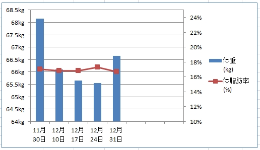 9月24からダイエットを開始して12月31日までの3.2ヶ月で74.5kg → 66.65kg、7.85kg痩せました。